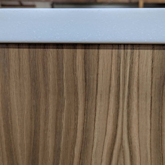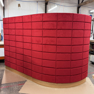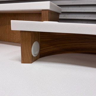 Finally, we manufactured a statement welcome desk, featuring a curved floating section with a bold red leg. The wood grain contrasts beautifully with the white Corian, creating a warm and professional first impression while showcasing our ability to handle complex curved and precision joinery projects.